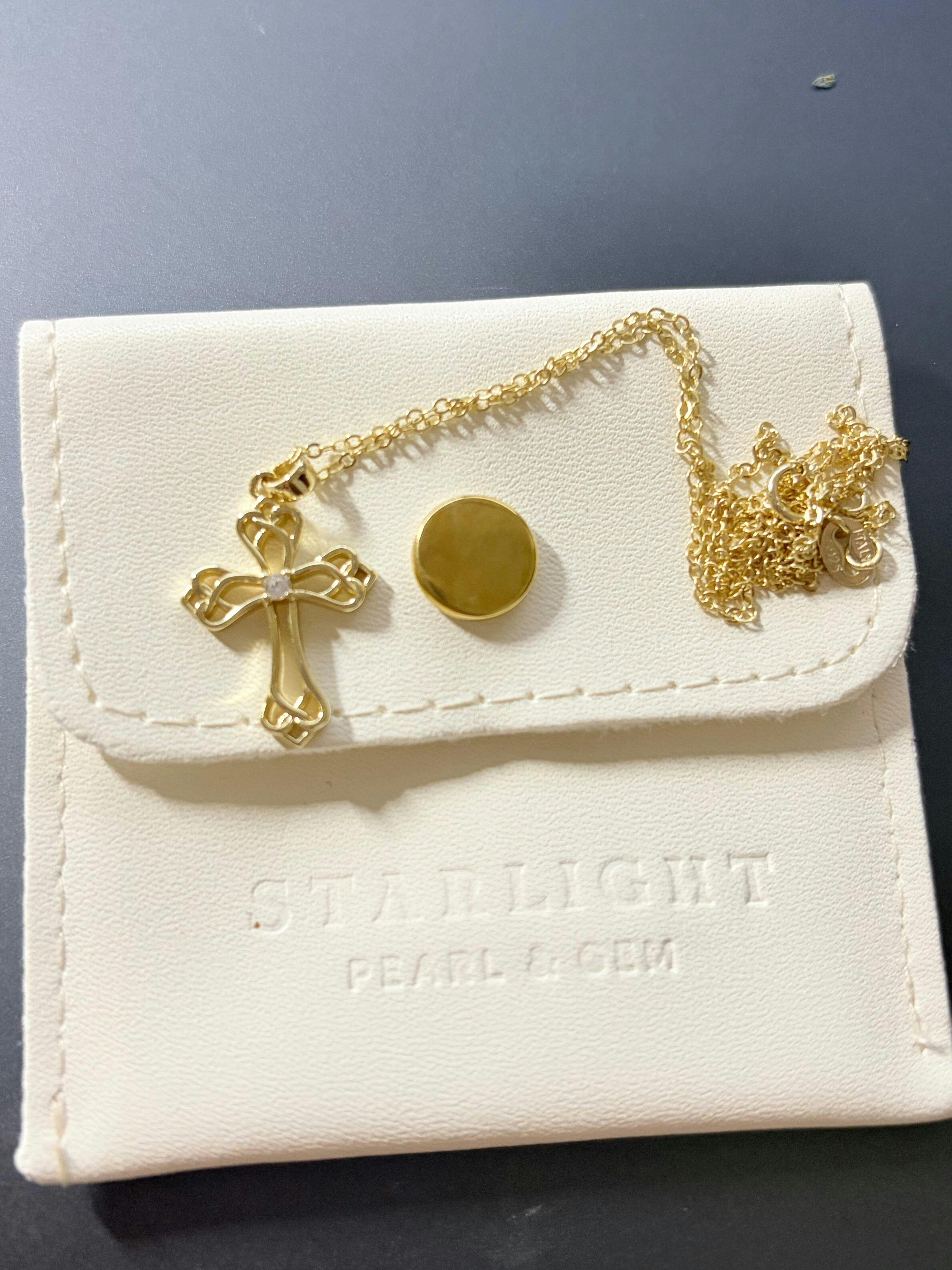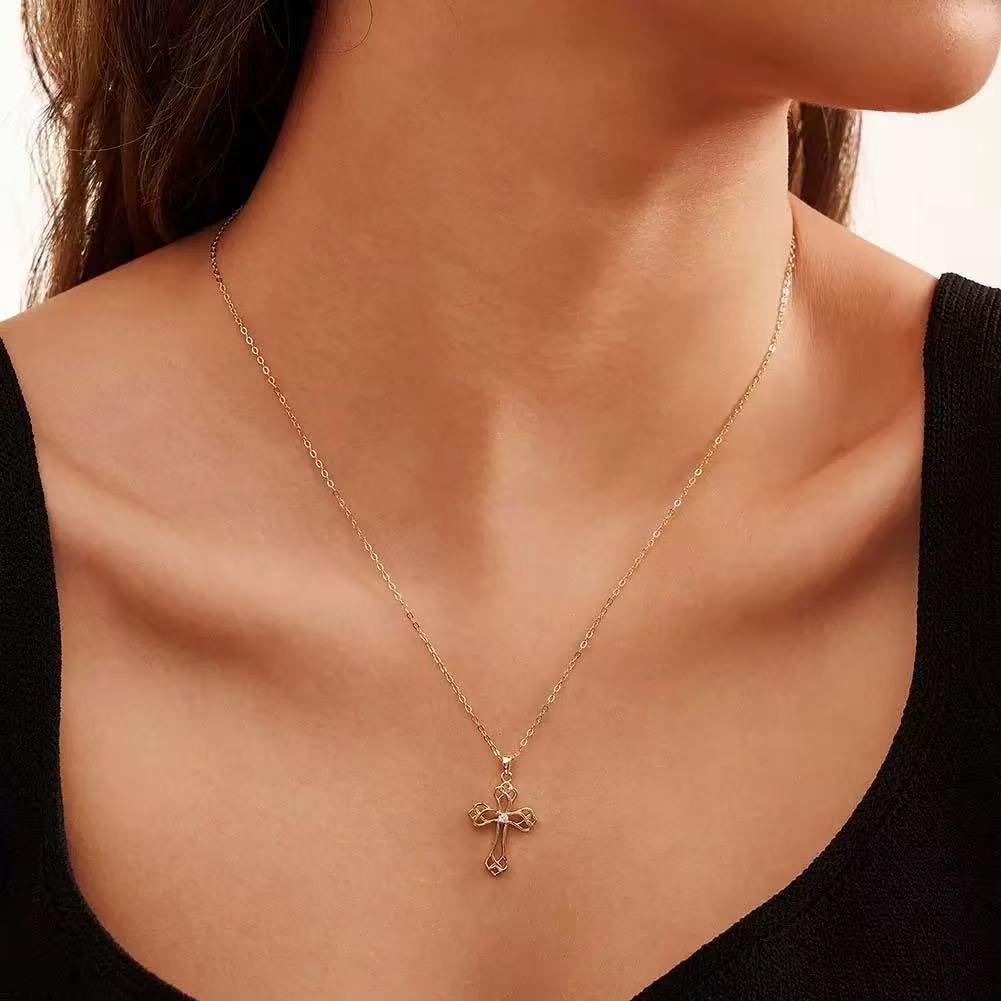 Crafted from 925 sterling silver and plated in 18K gold, the pendant features a delicate openwork cross design accented with a single AAAA-grade cubic zirconia at the center — representing light and purity.